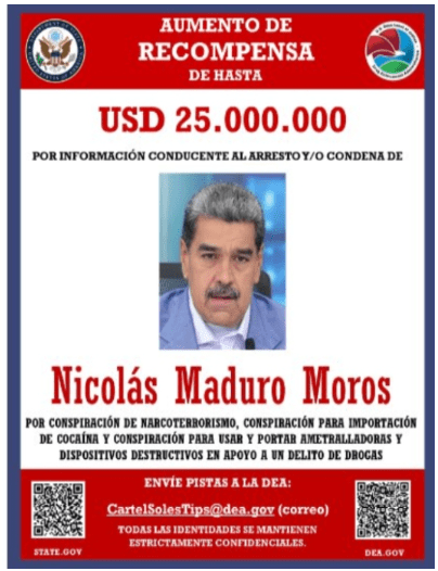 Actualmente con Venezuela y su presidente Nicolás Maduro el abordaje parece tener diferencias relevantes. Uno de los componentes clave es que el delito de narcoterrorismo se comete en contra de un Estado constituido por parte de organizaciones criminales.