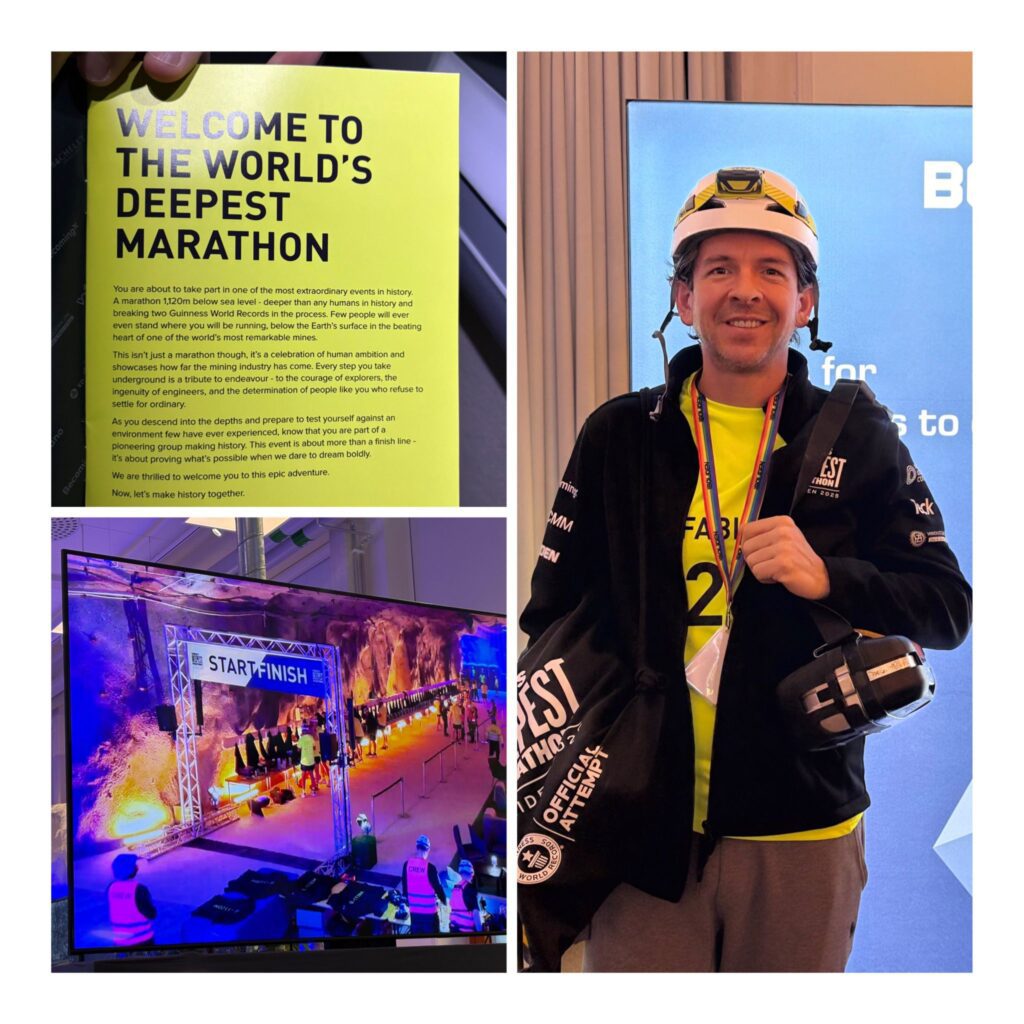 Ciudad de México, 27 de octubre, 2025.- A una profundidad de 1,120 metros, con una temperatura de 24 grados, y 70% de humedad, el mexicano Fabián Casaubón, llegó a la meta del World Deepest Marathon, con un tiempo de 4:46:15. Fue un gran esfuerzo, ejemplo de perseverancia, pues el evento se realizó al interior de la mina Garpenberg, en Suecia.